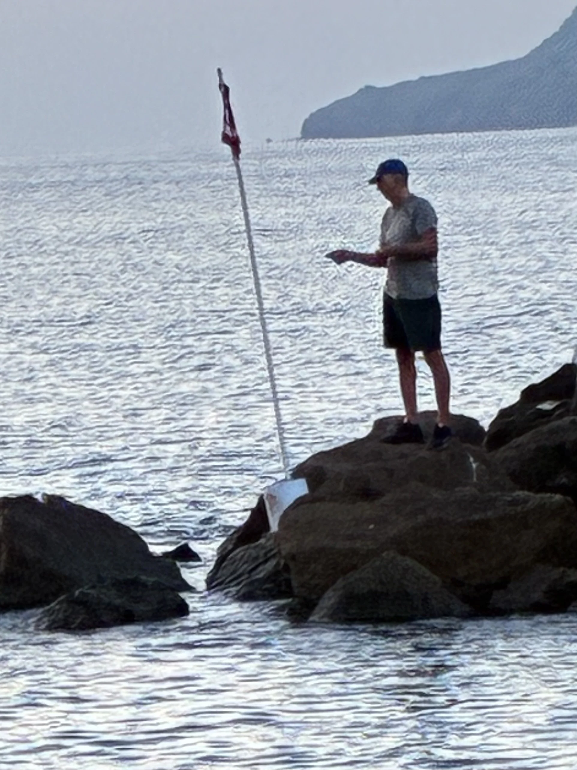 Más adelante dos gringos viejos pescan con caña, es zona de fondo rocoso, hay bancos de ostiones; nunca he visto que piquen peces. Uno de ellos está sentado, cabecea, dormita. Los dos son gordos. Fin.