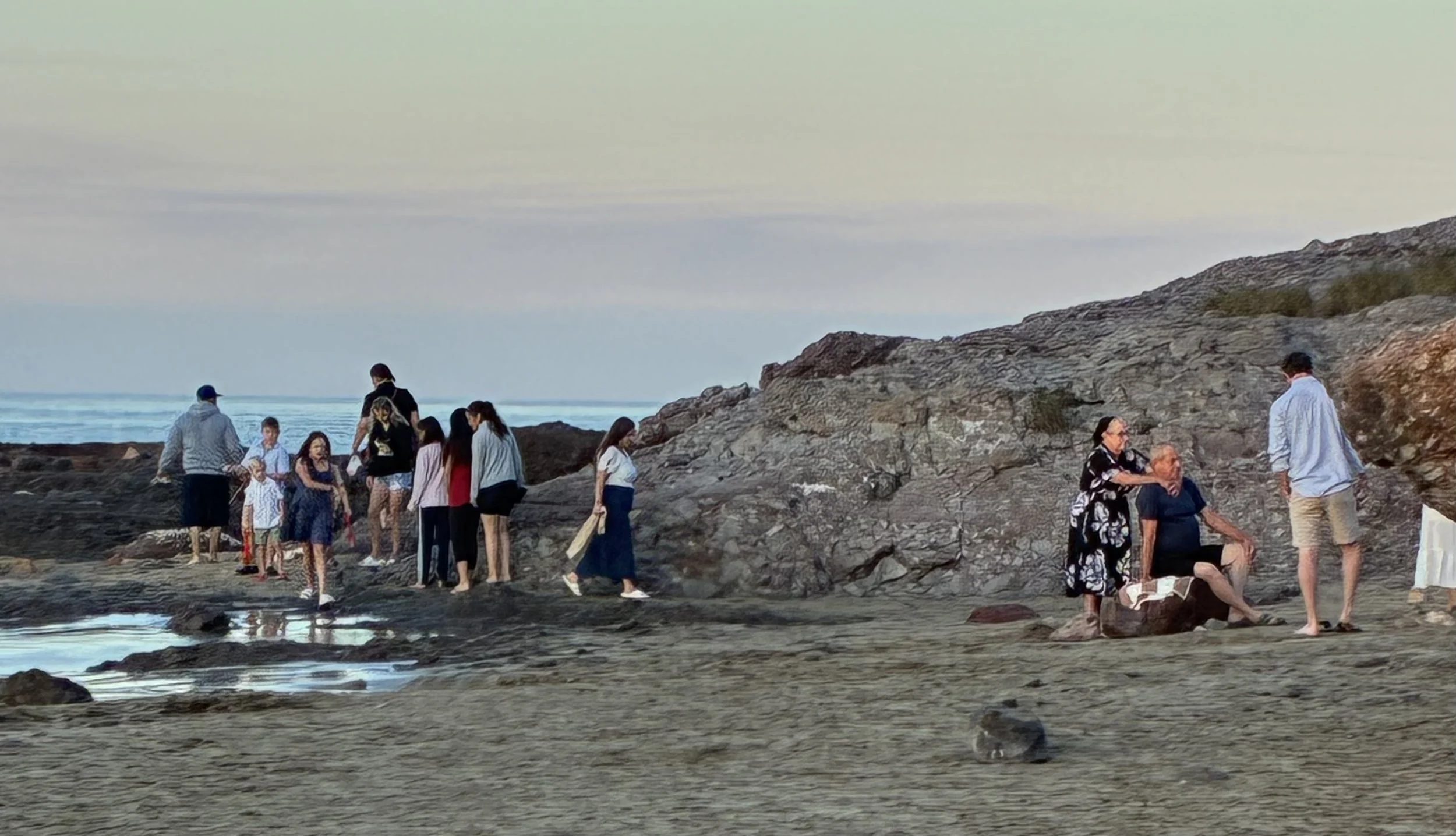 Familia con abuelos. Los miro un rato, van y vienen, acarician al Abuelo sentado en silla playera. Lo abrazan, se toman fotos. La Abuela lo agasaja. Es un chispazo de felicidad.