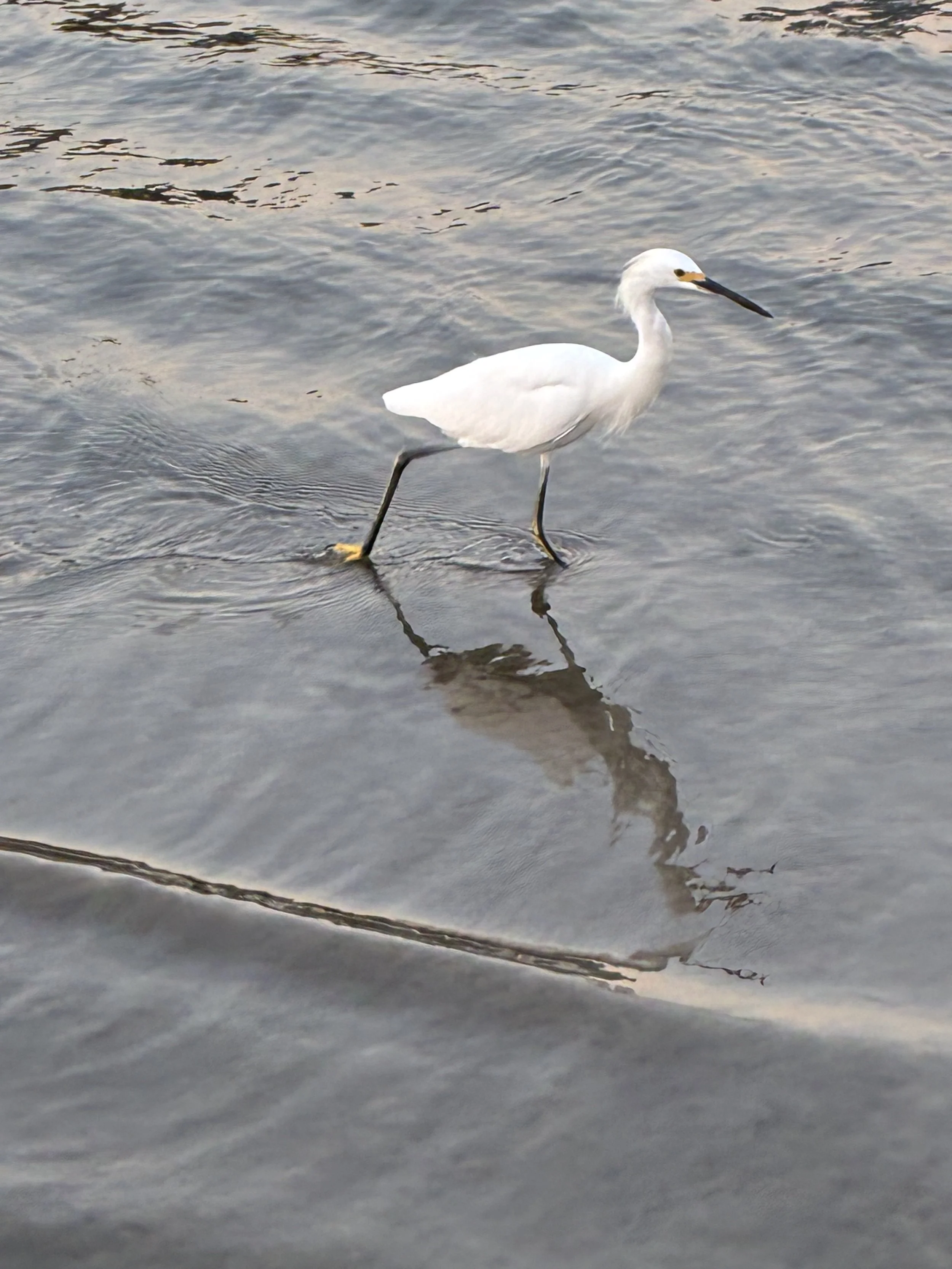 Hoy no vinieron a desayunar los Ostreros de pico naranja, pero sí unas aves más pequeñas que les decimos ”tildíos” y una tercia de garzas blancas, nerviosas y muy orgullosas de su blancura. Se creen la divina garza, pero las delatan sus patas plebeyas pintadas de amarillo.