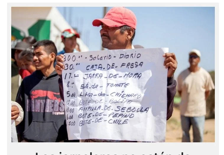 De esa manera el empresario evade cumplir con las prestaciones laborales; él no tiene jornaleros, las fresas, moras y arándanos se “pizcan” solos; no hay rastros de la relación laboral, no paga IMSS, no hay días festivos, ni horas extras…ni nada. Cuando va a ir personal de IMSS o de la Secretaría del Trabajo a la inspección, le avisan al dueño y ese día no hay jornaleros, solo está el personal administrativo que tienen todos los papeles en regla. Los jornaleros no existen ¿A quién le importa?. Pero ellos son los que generan la inmensa riqueza que disfrutan los oligarcas de las viñas de ira.