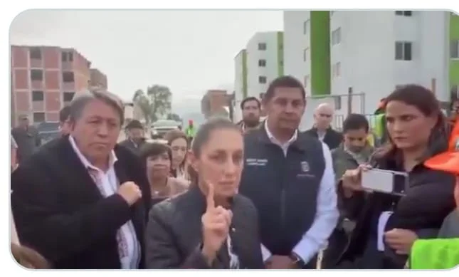 El dedito flamígero de Claudia, encabronada con los habitantes de San José Chiapa, Puebla. Interrumpieron su evento, no quieren que les echen 7 mil toneladas de basura diaria en el traspatio de su pueblo para poner un Polo de Desarrollo reciclador de Basura. El Gober “Simi-Precioso”, observa cómo un bulto.