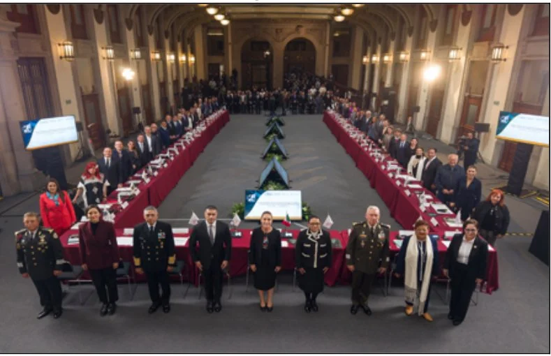 Manteles rojos; al frente los ojos, oídos, músculo y cerebro de la República: los tres ejércitos nacionales (Sedena, Marina y Guardia Nacional), el Comisario Federal de la Policía (el guapo del Gabinete), la Secretaria de Gobernación, la Fiscala de la República, dos mujeres que cumplen funciones de coordinación en seguridad Pública, Marcela Fregoso (de pantalón Bonchi) y Laura Velazco, a un lado de la inconfundible Ernestina Godoy; al centro, la Jefa de Todos, la Presidenta Claudia Sheinbaum Pardo y en filas laterales los 32 gobernadores de los Estados libres y soberanos del territorio patrio.