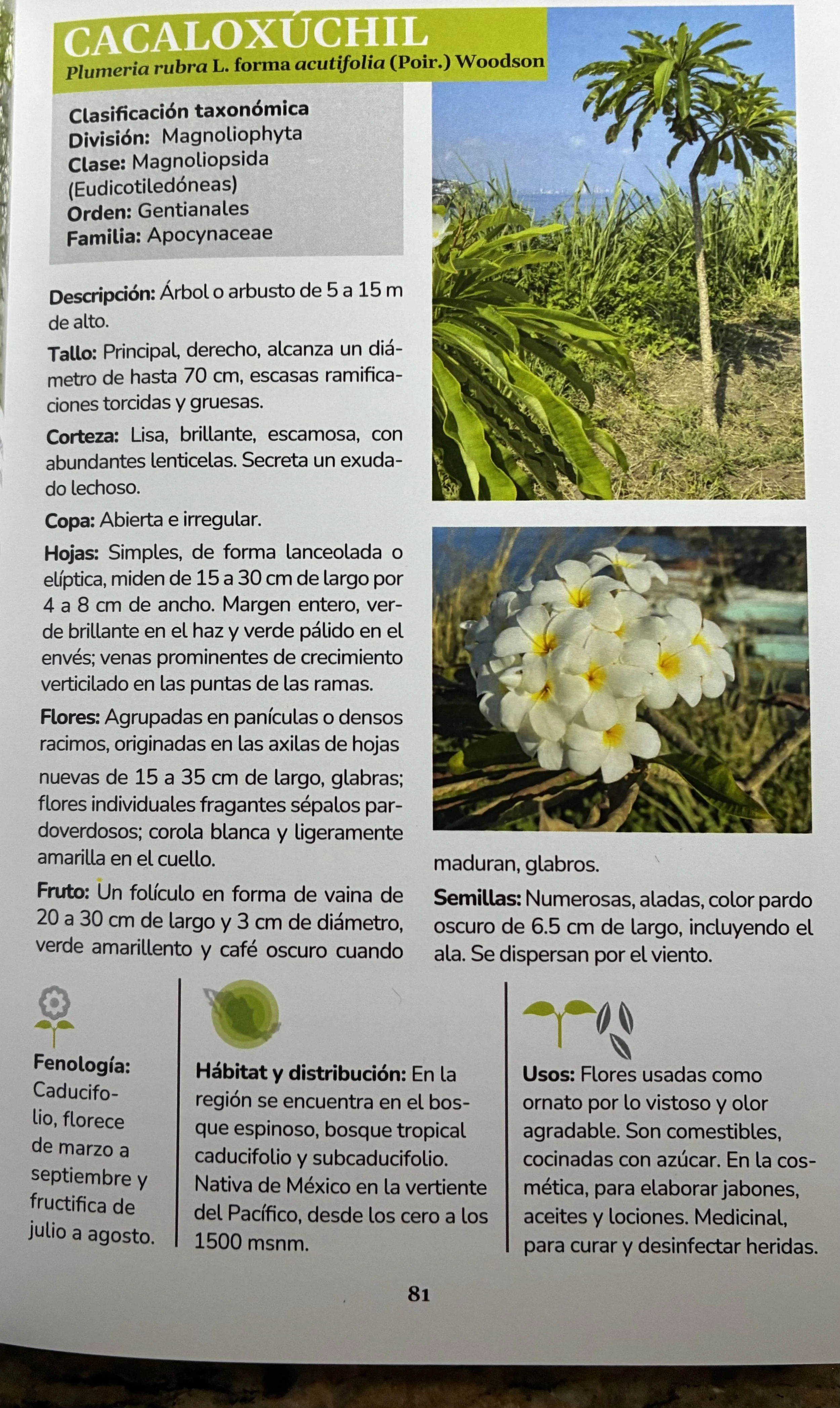 Revisaron con detalle: hoja, flores, tallos, frutos y semillas; en que temporada florecen y que insectos o aves las visitan y sirven de “casamenteros” para lograr la polinización; también en unos recuadritos, informan si están en alguna categoría de riesgo o bien si su uso es medicinal, de ornato o para combustible. El libro es una guía excelente para ponerte en contacto con la vegetación del Cerro del Faro; en un apartado final, hacen una propuesta de reforestación y ajardinamiento del lugar, también incluyen, como en los libros de antes, una útil glosario, porque si bien sabemos que es una espina, es difícil que el lector común sepa que “Aquenio es un fruto seco”.