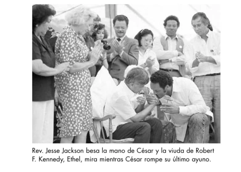 César en 1988, Al terminar la huelga de hambre de 36 días en protesta contra el uso de plaguicidas que afectan la salud de niños y jornaleros. Lo acompaña el Reverendo Jesse Jackson, quien le besa la mano; observa la viuda de Bob Kennedy.