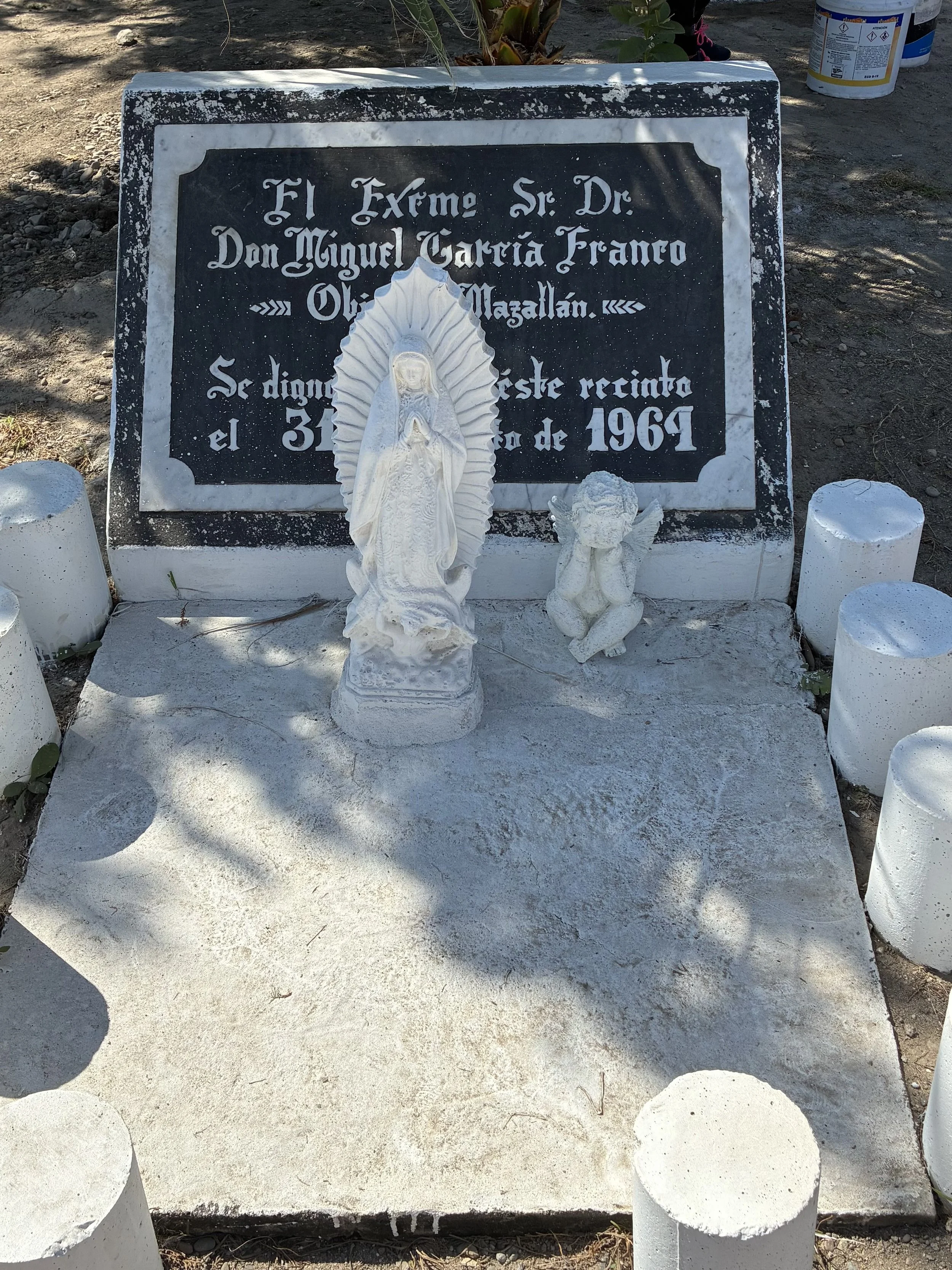 Cerca de ahí, yace una placa conmemorativa, avisa que el Excelentísimo Dr. Don Miguel Garcia Franco, Obispo de Mazatlán, estuvo aquí y se dignó bendecir, en el lejano año de 1964, este santo cementerio.