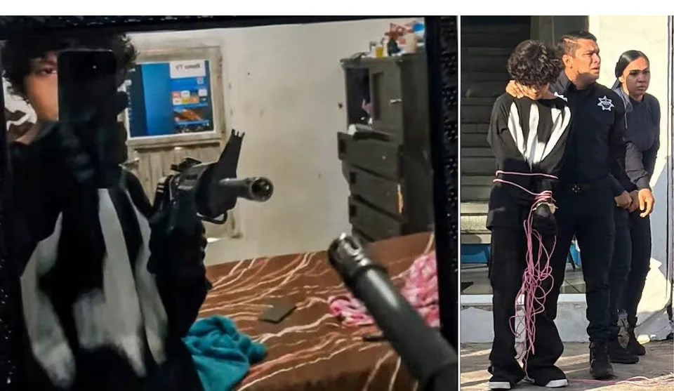 En la izquierda el chamaco vestido de negro, presume el rifle de asalto. Está en su recámara. A la derecha, amarrado con una soga, ya sometido por la policía.