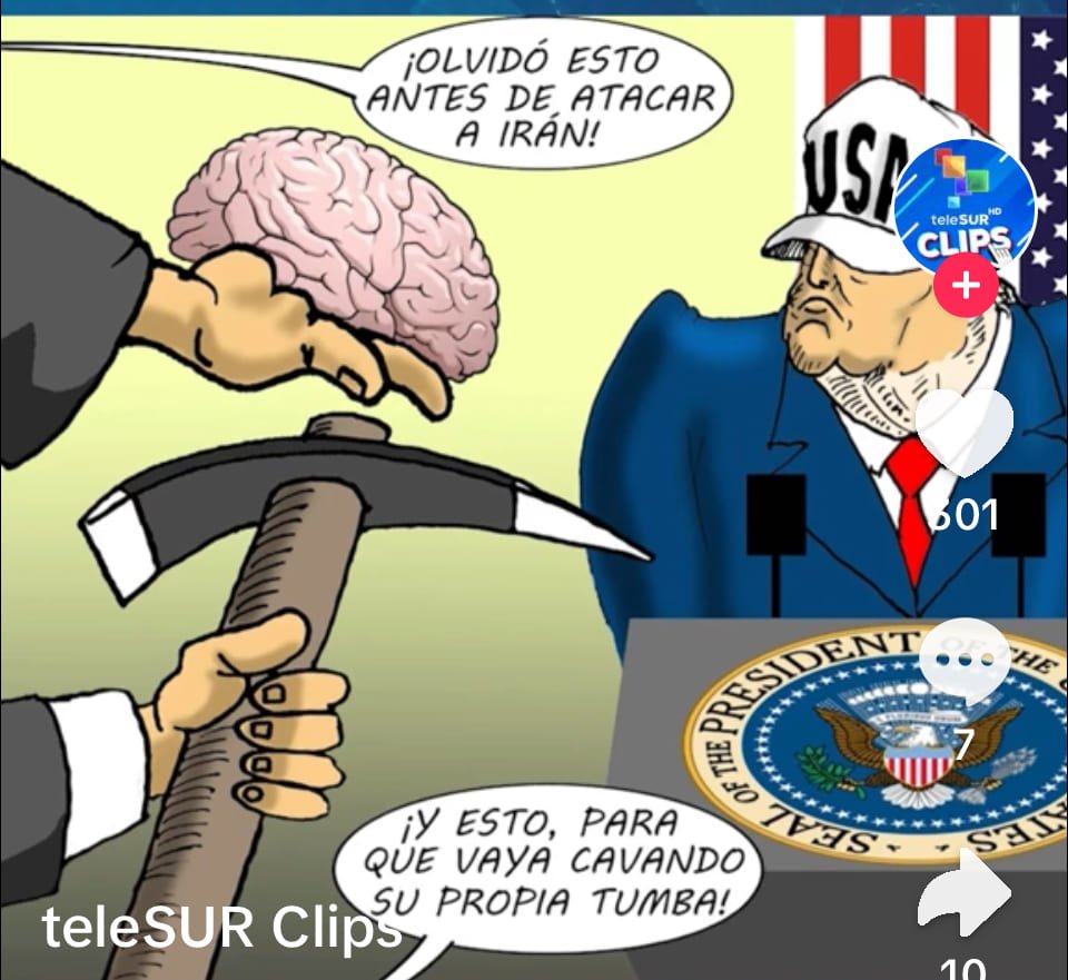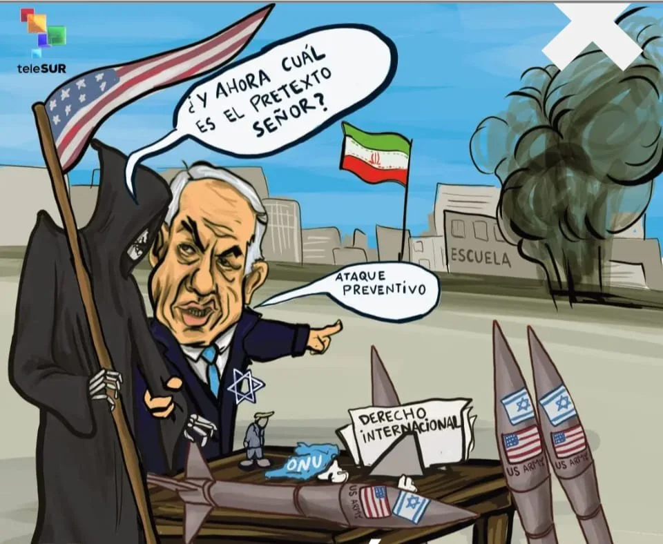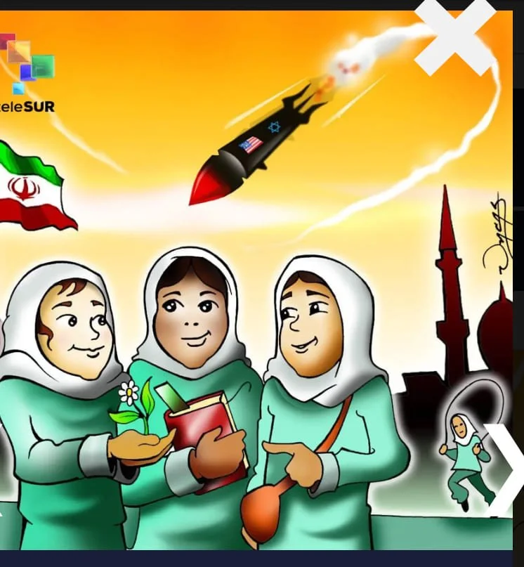 El primer bombardeo a Irán destruyó una escuela de niñas, matando a todas las alumnas y sus profes (Caricatura de TeleSur).