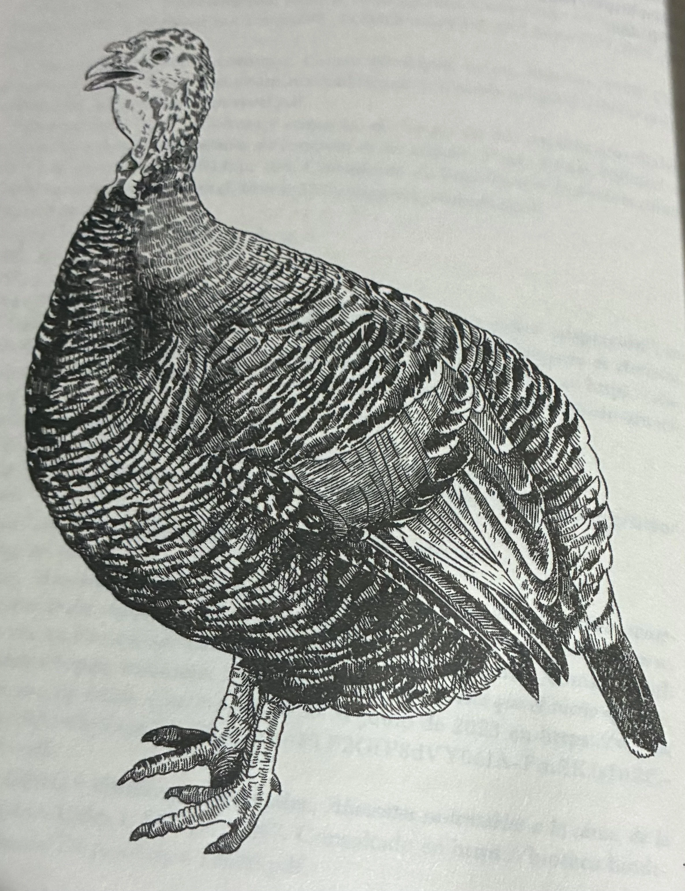 Guajolote, Guíjolo, Pípila, Cócono, Totoli, Huexolotl. Fue domesticado hace 3200 años aquí en México. Todavía hay un Guajolote silvestre en la selva maya, el Guajolote Ocelado, no se deja domesticar, le huye al depredador más voraz: el ser humano.