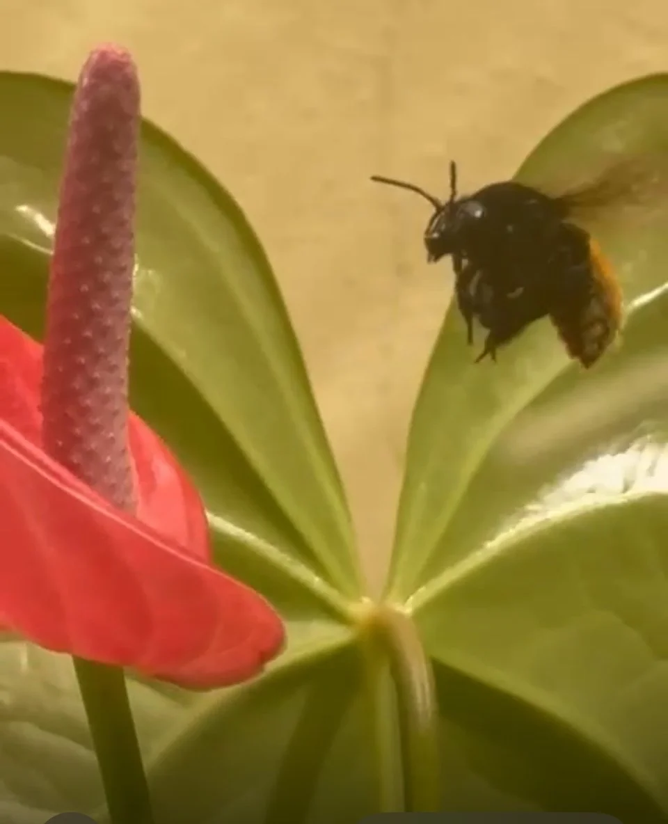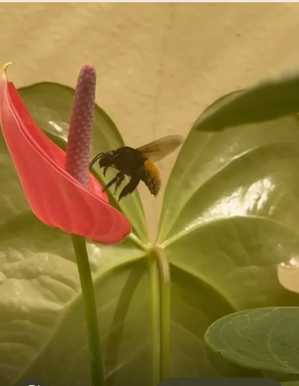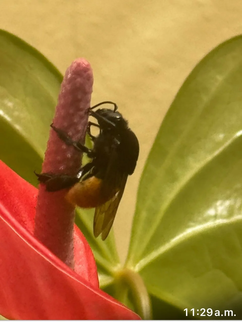Nuestra obrera mielera, se posó en el bastón de la inflorescencia, formada por decenas de florecillas, acunadas y protegidas por una hoja modificada en rojo; hizo una evaluación rápida del botín y con maestría profesional empezó un raspado meticuloso y zumbante, recolectando polen y propóleo de cada una de las diminutas flores de la Anturia; terminada su labor minera, con las alforjas llenas del tesoro obtenido, despegó agradecida, haciendo una reverencia volátil. La Abeja de enero.