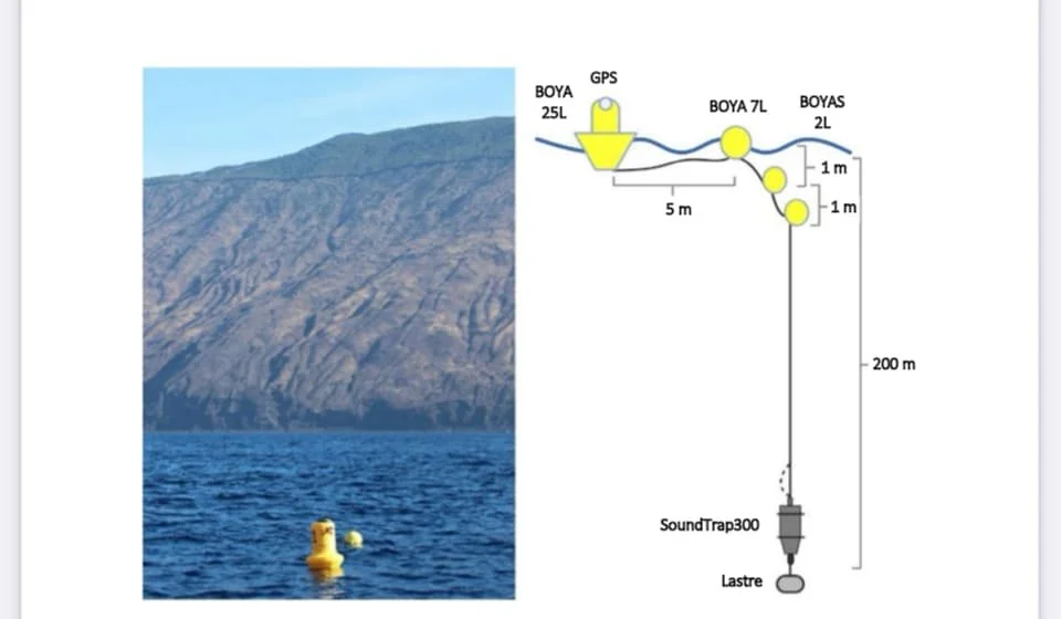 El equipo flotante para registrar el canto de la ballena. Es un hidrófono con GPS para ubicar su posición.