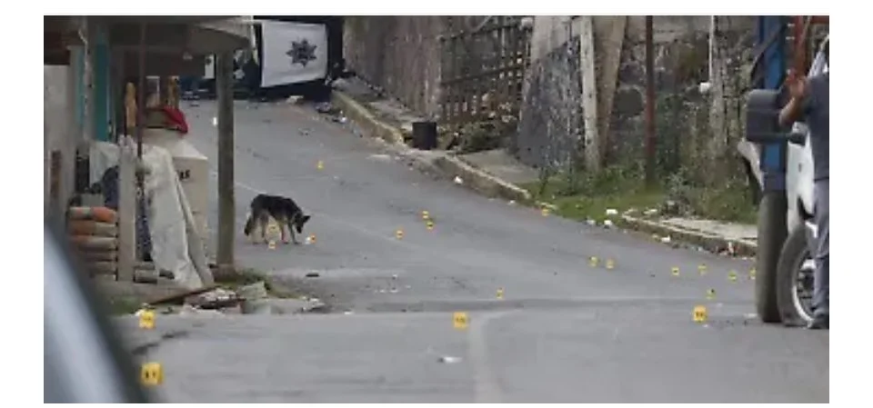 Un perro huele la sangre. En la calle, los casquillos percutidos.