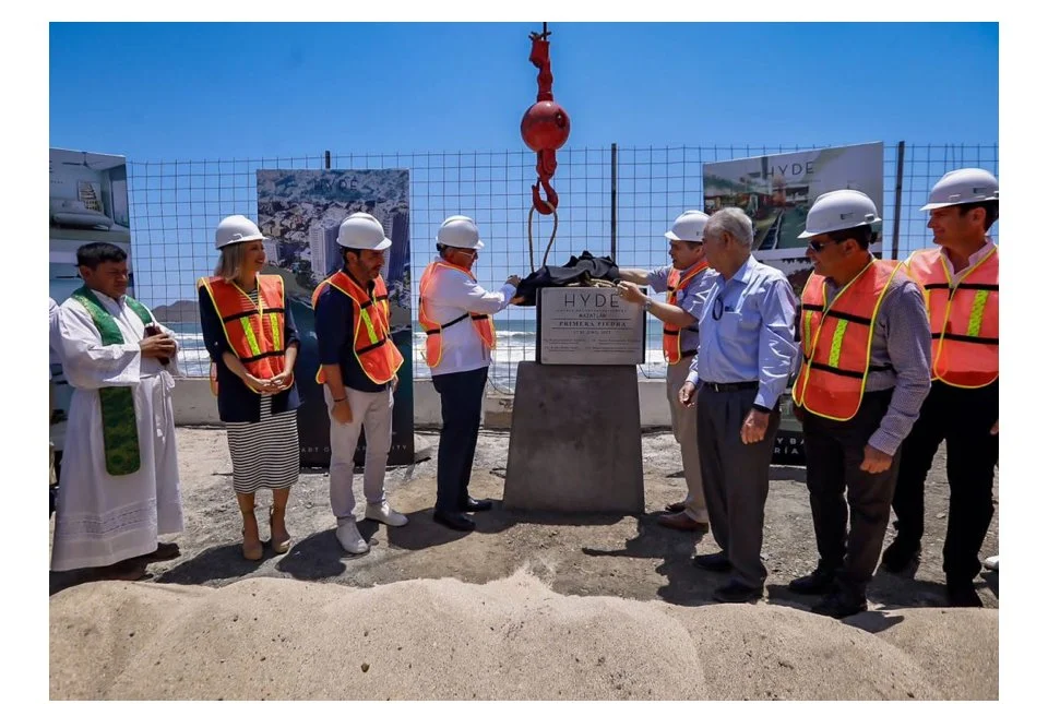 El Gobernador Rocha coloca la primera piedra del Hyde en junio del 2023. Nunca falta el curita gordo que el nombre de los santos intereses del capital inmobiliario bendice la obra.