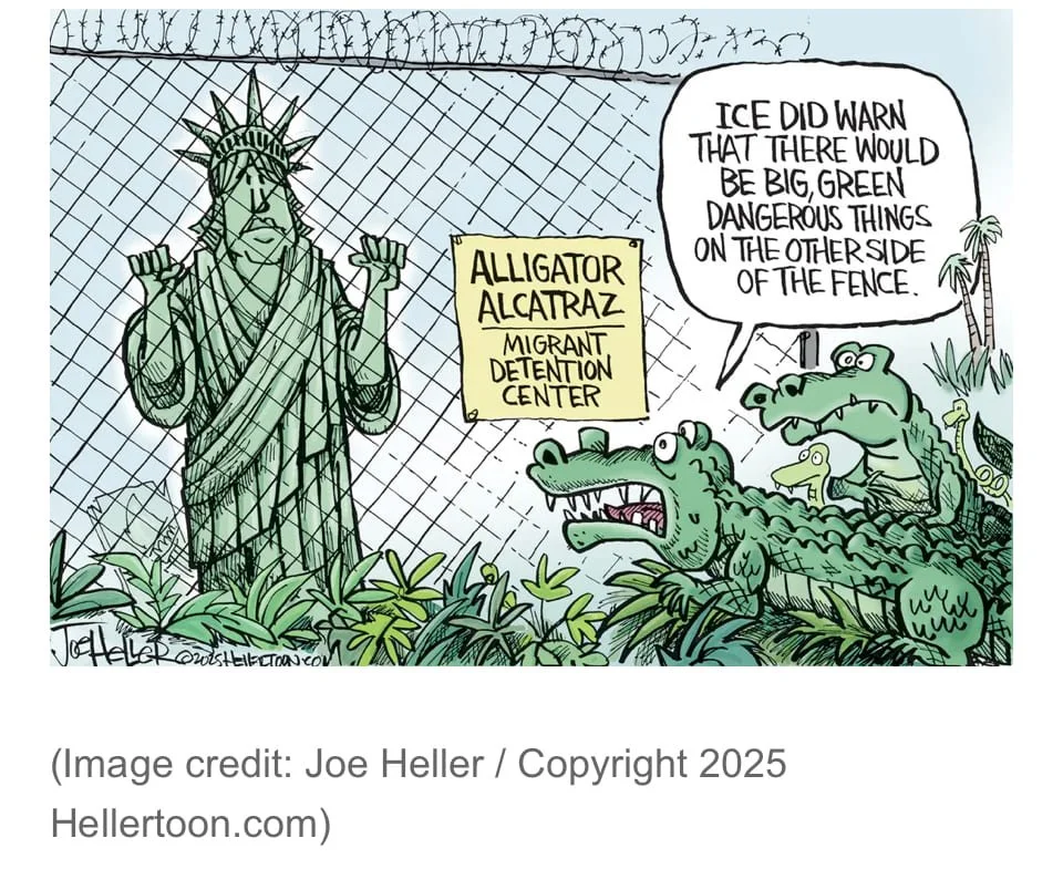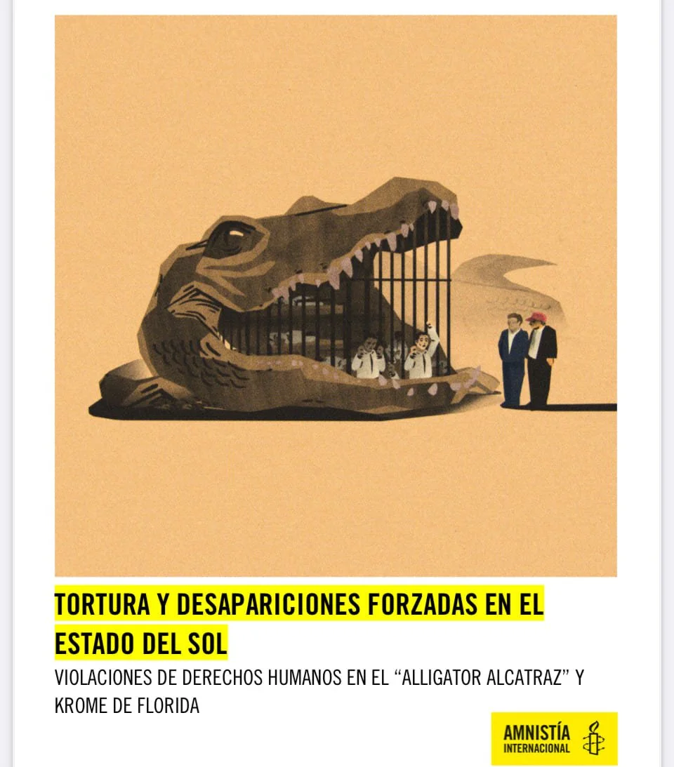 Amnistía Internacional, en diciembre del 2025, publicó El informe,: “Tortura y desapariciones forzadas en el estado del sol: violaciones de derechos humanos en Alligator Alcatraz y Krome de Florida”. Uno de los detenidos en esas mazmorras, dejó su testimonio: “Nos tienen encerrados en jaulas de mil pies cuadrados. Hay 32 personas en cada jaula, y hay 8 jaulas dentro de la carpa. Las luces son como las luces de los estadios; siempre están prendidas, nunca se las apagan ni bajan la intensidad. Hace mucho frio, el aire acondicionado es muy fuerte. Hay muchos mosquitos.”