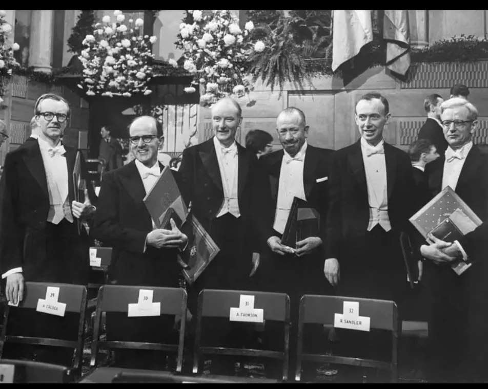 Premios Nobel de 1962. El tercero de la izquierda es Francis Crick, a su lado John Steinbeck (el de “Las Viñas de Ira”). Junto al flaco y risueño Jim Watson.