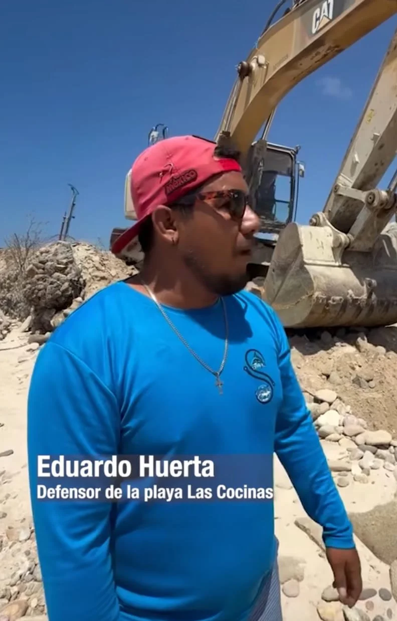 Los defensores de la playa Las Cocinas no son políticos de oficio, es raza del pueblo, pescadores, buzos ostioneros, nadadores y surfistas. Eduardo un defensor, atrás, los monstruos amarillos que destrozan la playa.