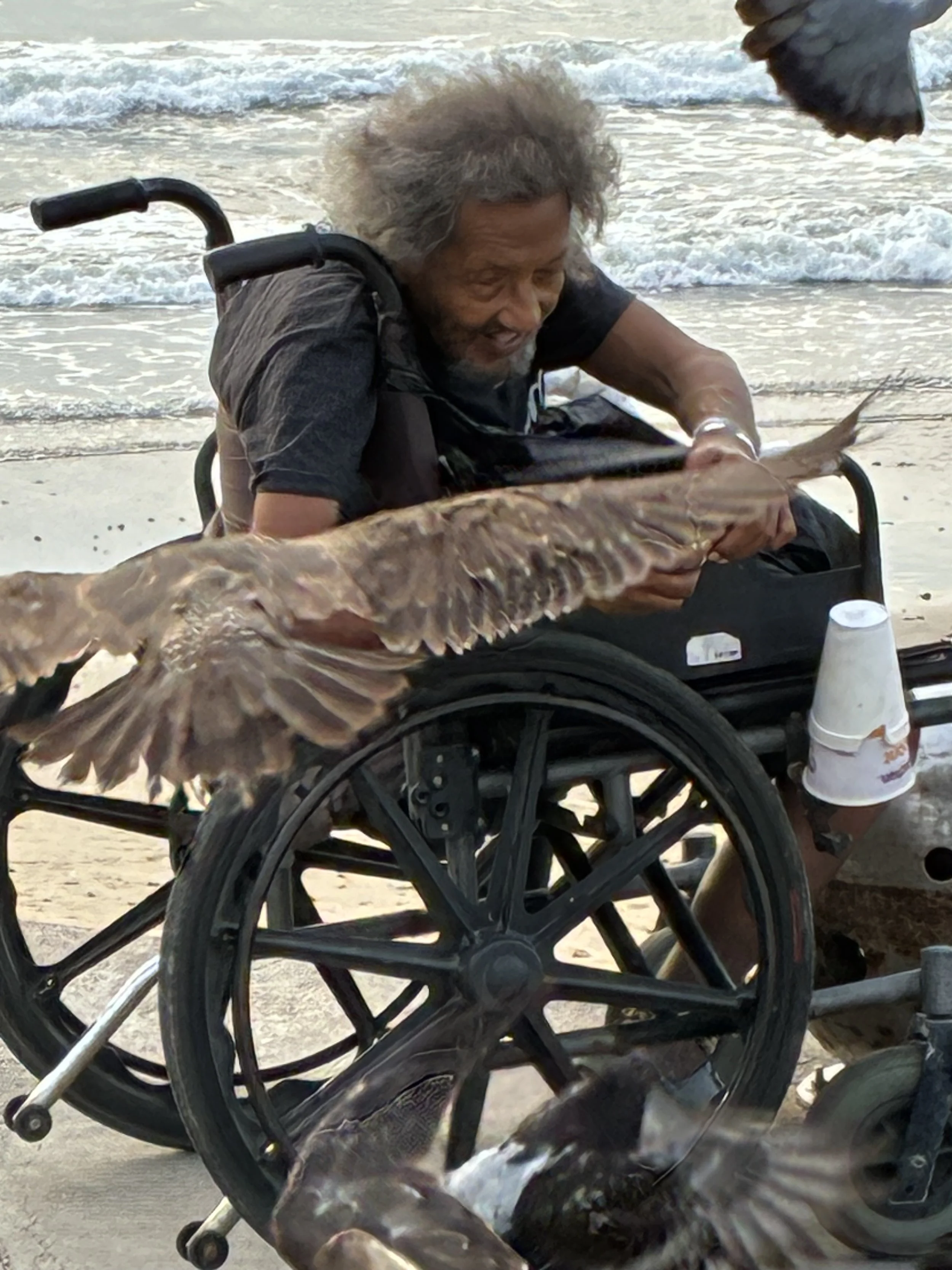 Un anciano indigente alimenta con pan a pichones playeros; se le ve contento, siente ser parte de algo más grande. Me acerco, su cabellera encrespada, frente amplia. Le falta una pierna. Quizá fue albañil, pescador, chofer…Tuvo una familia, fue feliz. ¿En qué recodo del camino dejó su pierna difunta?. Quién sabe. Me dijo llamarse Santiago. No le creí.