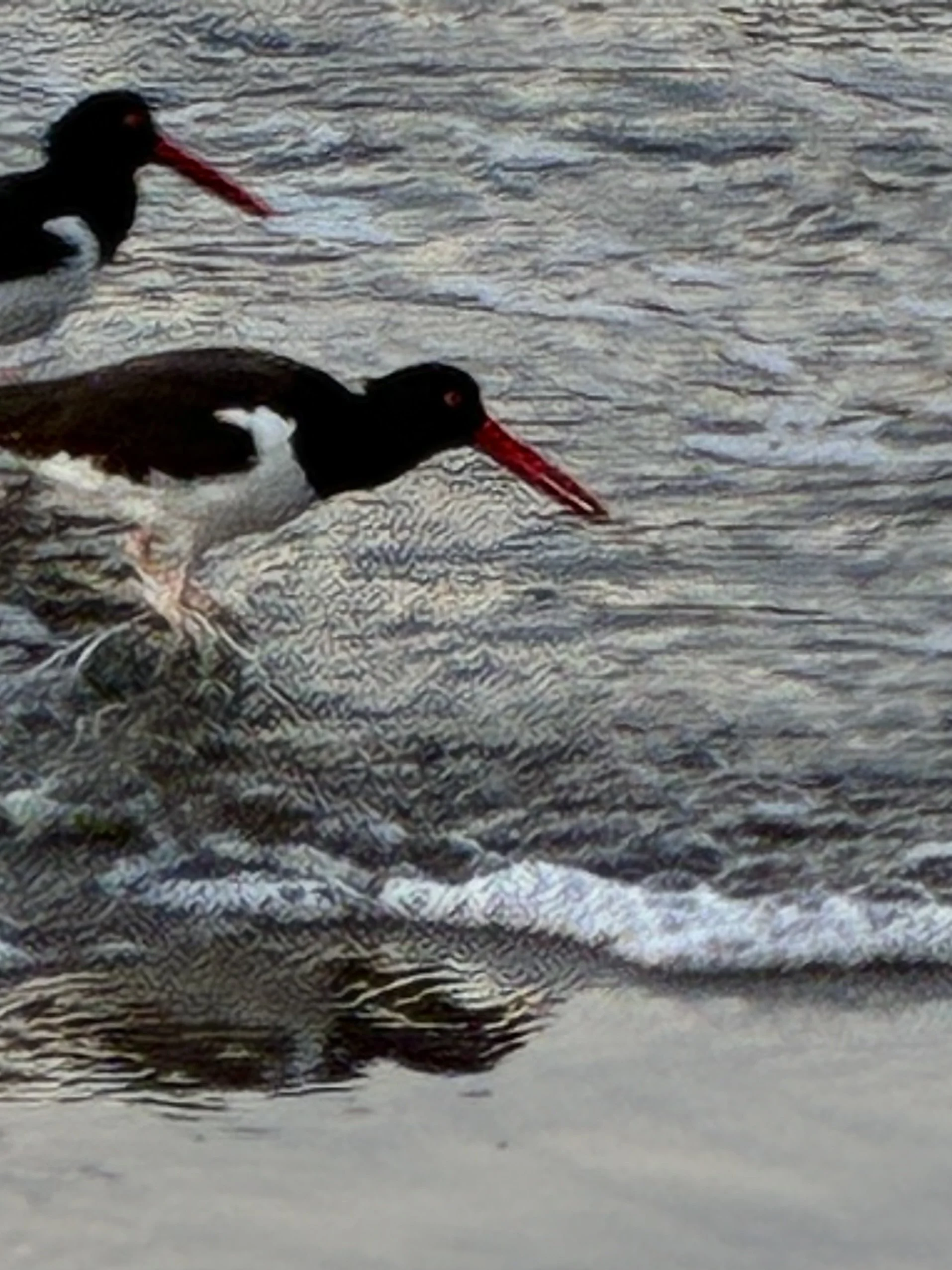 El Cochito (también le dicen Muy-Muy), saca sus dos plumas para atrapar el plancton cuando regresa la ola; momento que aprovecha el Ostrero para pescarlo con su potente pico anaranjado.