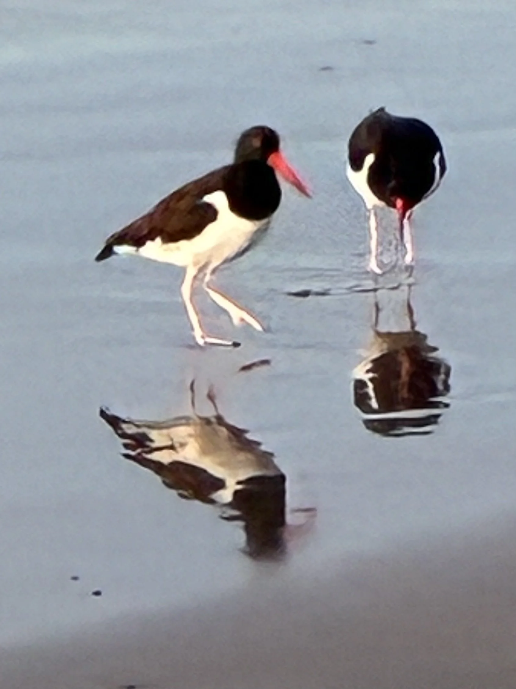 Son las seis de la mañana, la playa por el “Chiles Pepper”, extrañamente limpia, sin botes, ni restos de pizzas ni bolsas de papas ni pedazos de tomates ni mitades de limones. Una pareja escribe su nombre en la arena mojada, quizá recién casados; más allá en la línea del horizonte, por atrás de la Isla Pájaros, se anuncia un amanecer dorado; ninguna ave vuela en el cielo de la Bahía, pero a ras de playa, dos Ostreros Americanos desayunan cochitos o topos de arena, son crustáceos pequeños como barrilitos, ahí viven, se entierran en la arena, cuando la ola regresa saca dos plumitas y atrapan su comida, pero es el momento que aprovecha el Ostrero y los captura con su enorme pico anaranjado. Estos dos andan muy activos, ya son adultos y para febrero-marzo empieza su temporada reproductiva.