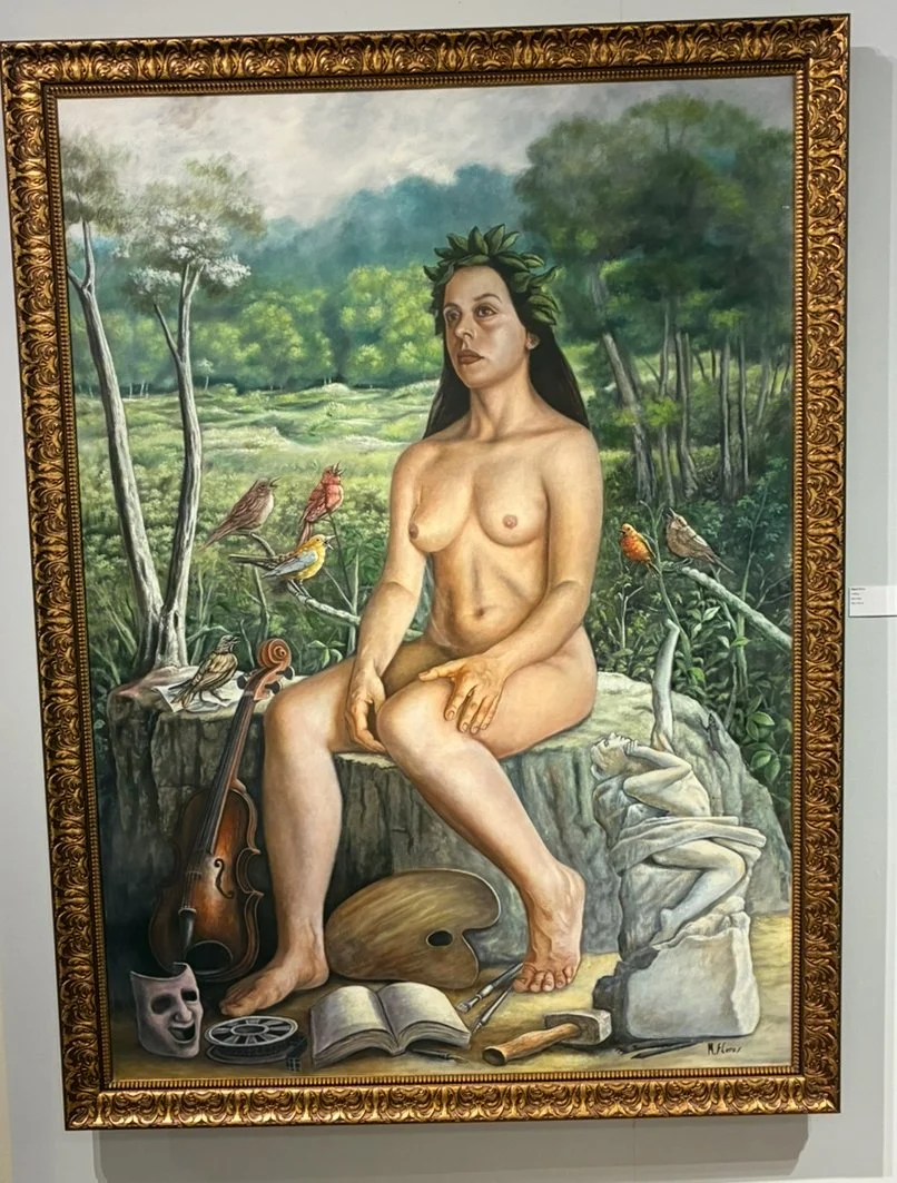 Un desnudo con pájaros. La mujer brota de la naturaleza; no hay sonrisa enigmática de Mona Lisa; sino porte orgullosa de su belleza; al fondo un volumen boscoso. A sus pies tiene los símbolos de las bellas artes: escultura, pintura, literatura, teatro, música y cine.