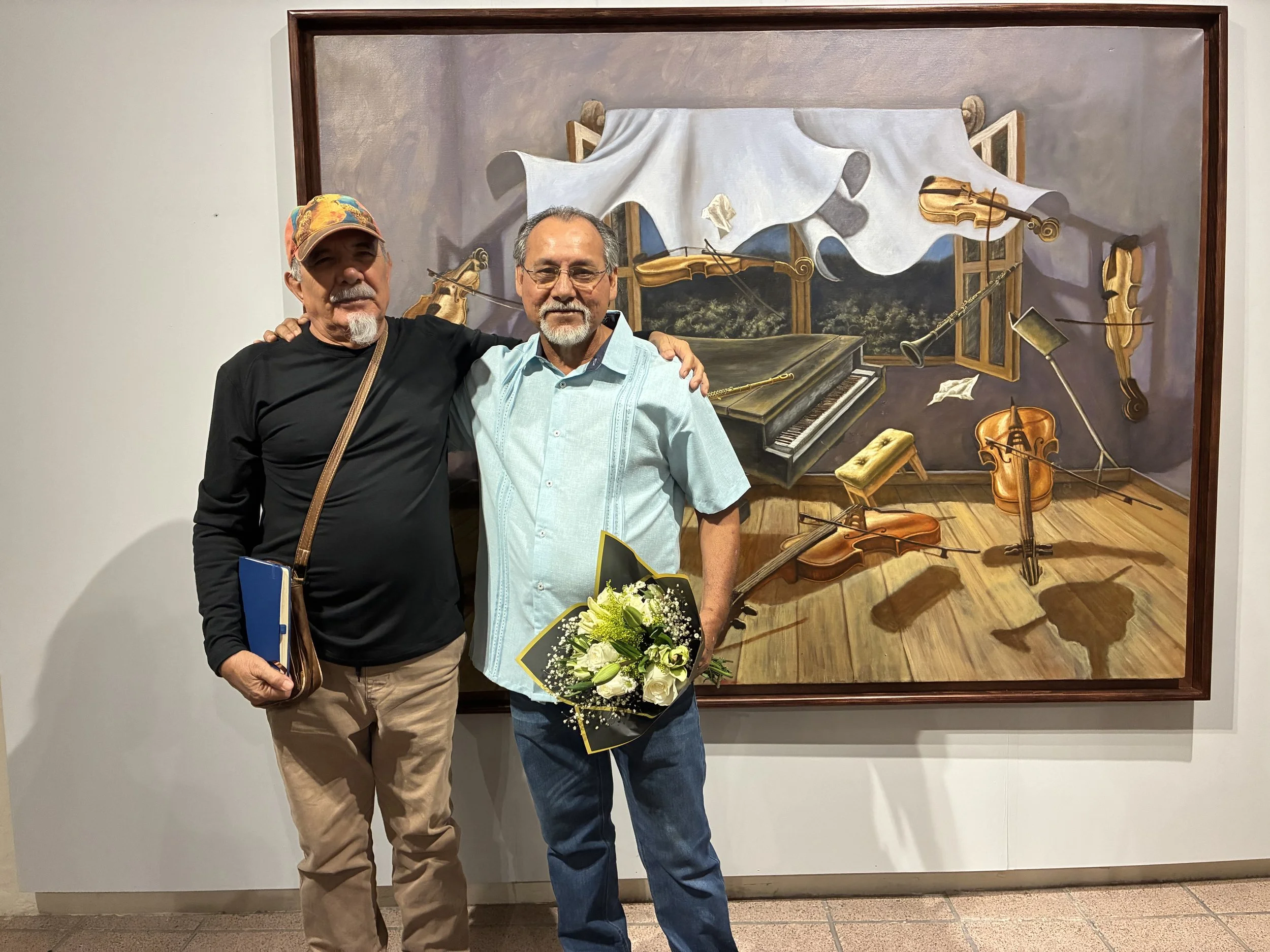 Con el Pintor Miguel Flores. Atrás un cuadro surrealista, los instrumentos y partituras flotan ingrávidas; las cortinas ondean y dejan ver un exterior en penumbra.